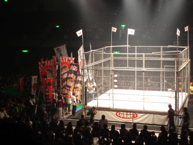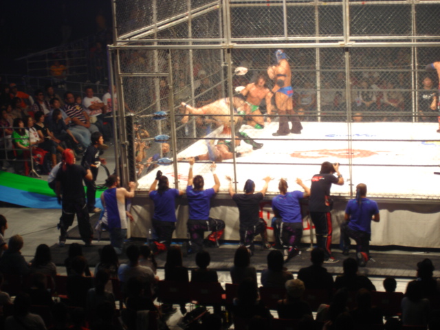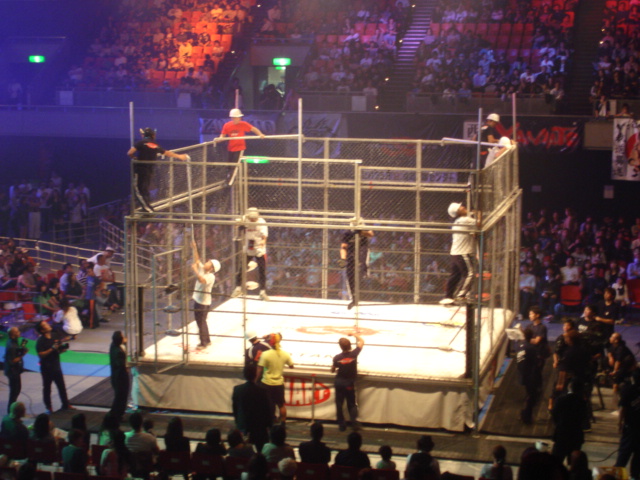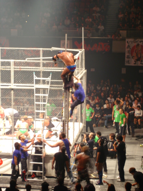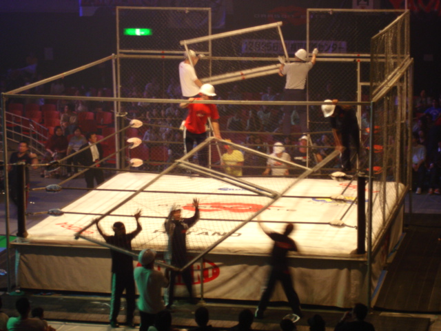 一方、巨漢のサイバーは金網を登りきれないのに、どうするつもりなんだろうと思ってたら、セコンドが用意した縄梯子でエスケープ。